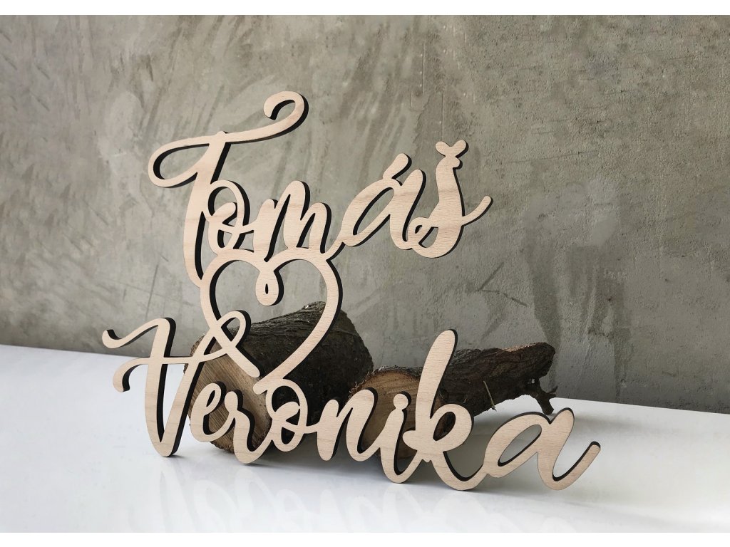 Dvě jména se srdcem NA MÍRU - z Bukového dřeva vyřezané dvě jména dle vašeho přání. Hodí se jako originální dárek k narozeninám, svatbě, kolaudaci, výročí, vánocům a jiné.